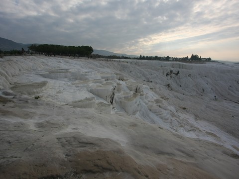 | パムッカレと呼ばれる場所です。白いのは全て石灰岩。壮大な景色が広がっていました。お湯が流れている溝があって足湯ができるんですが、その際脱いだ靴は自分で持っておかないと、周囲でたむろしている犬に持っていかれてしまいます。 |