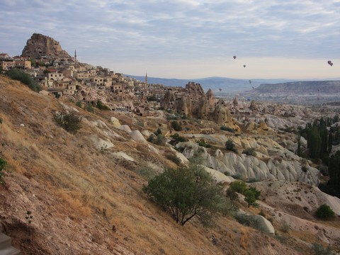 | 奇形奇岩のカッパドキア。遠くの方には気球がたくさん飛んでいます。私も飛んでいきたくなりました。 |