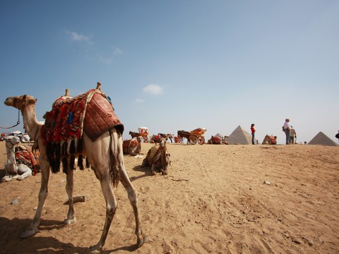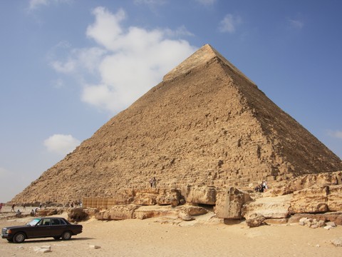 | ようやくエジプトに入りました。説明不要のピラミッドです。意外と街中から近いところにあるのが驚きでした。街からもこの四角すいが望めます。とにかくそばで見るとでかいの一言。そして中は暑い、狭い、臭いの三重苦。 |
