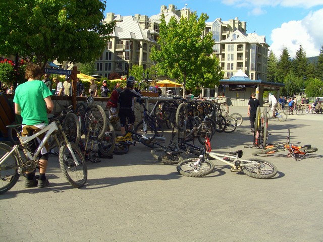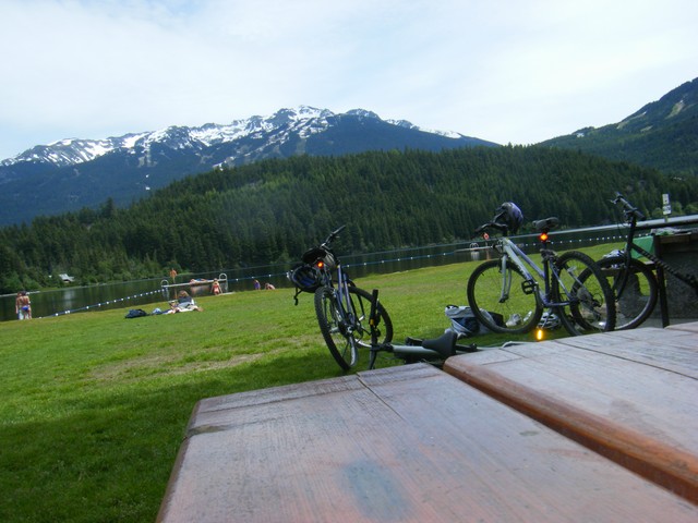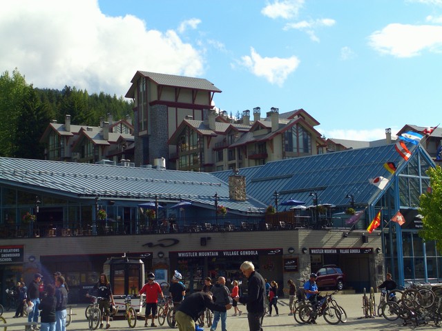 カナダでは主にウィスラーで滞在してました。ウィスラーはカナダのリゾート都市で、2010年バンクーバーオリンピックの山岳競技の主要会場となる予定だそうです。スポーツも盛んで冬はスキー・スノボー、今の時期はマウンテンバイクが有名です。確かにすごい数のマウンテンバイクでした。さらには今の時期でもスノーボード背負った人もいましたし。